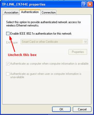 Hacemos click en la pestaña Autenticación y desactivamos la opción Habilitar autenticación IEEE 802.1x para esta conexión de red. Si la conexión se comprobó, tras verificar que el motivo del error no pudo encntrarse el certificado para conectar a la redes que el router inalámbrico no está configurado para la seguridad del certificado.