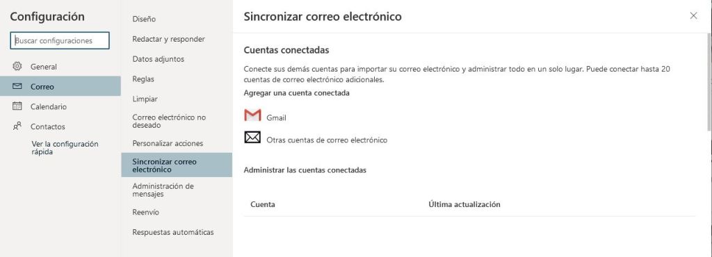 En la pestaña Correo\Sincronizar correo electrónico podremos sincronizar hasta 20 cuentas de servicios diferentes para leer gestionarlo desde nuestra bandeja de Outlook, organizandolo por carpetas o desde la bandeja de entrada. Concediendo la respectiva verificación desde la otra cuenta a través del código o correo enviado, también disponemos de la opción manual, dentro de otras cuentas, si conocemos los datos del servidor de entrada/salida correspondiente al servicio.