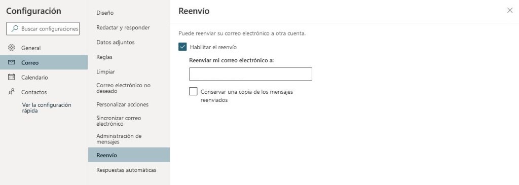 Desde la pestaña de Reenvío podremos habilitar que se reenvíen todos los correos a la cuenta que introduzcamos y, posteriormente, verificando la correspondiente verificación por correo o código en la cuenta que hayamo agregado.