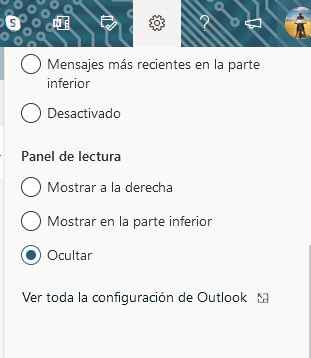 Para ello nos dirigiremos a la opción de configuración de Outlook (en la rueda superior derecha de la pantalla) y haremos click en la opción Ver toda la configuración.