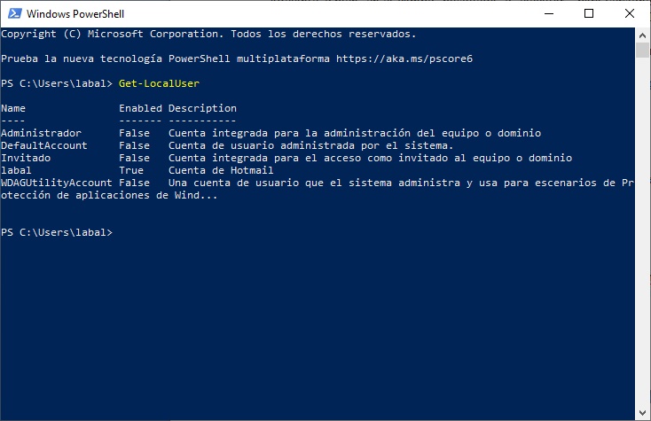 Abrimos PowerShell de nuevo, escribimos el comando ‘Get-LocalUser’ y pulsamos ‘Enter’. Revisamos la lista de nombres de usuario si aparece el nombre que hemos cambiado.