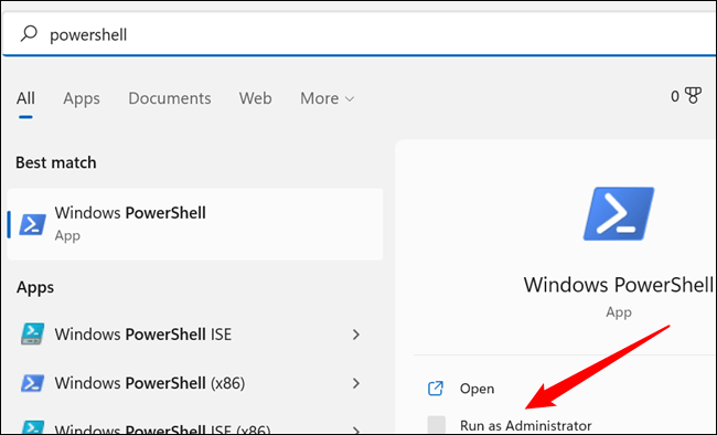 En este ejemplo usaremos PowerShell, haciendo clic en el botón Inicio, escribiremos powershell en la barra de búsqueda y luego hacemos clic en Ejecutar como administrador.